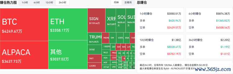 24小时爆仓数据:全球共120964人被爆仓 ,爆仓总金额为2.2亿美元,其BTC爆仓4249万美元、ETH爆仓3358万美元、ALPACA爆仓3637万美元