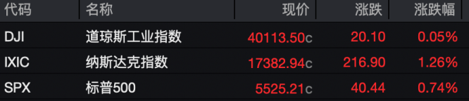 截至收盘,道琼斯工业指数涨0.05%,报40113.5点;标普500指数涨0.74%,报5525.21点;纳斯达克指数涨1.26%,报17382.94点。本周,道琼斯工业指数涨2.48%,标普500指数涨4.59%,纳斯达克指数涨6.73%。